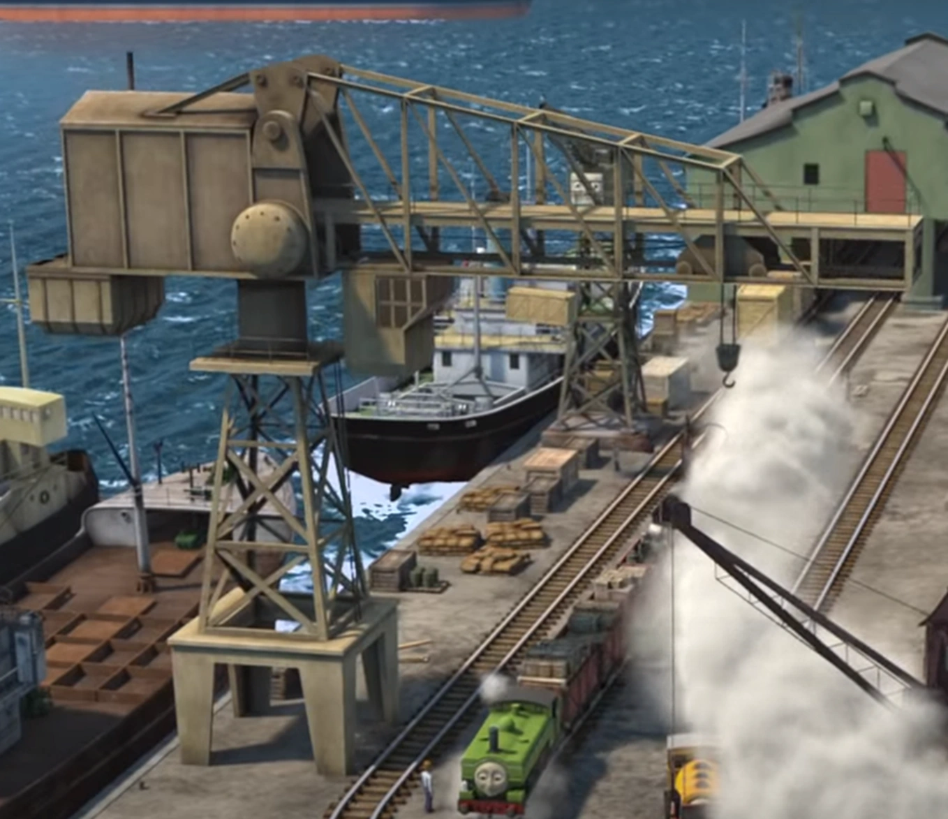 - В 2D-перезапуске основного мультсериала, «Томас и его друзья. Всем паровозам вперёд», его заменил жёлтый башенный кран без кабины.