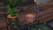 - Показан дым, выходящий из боковых сторон вместо её черной выхлопной трубы, установленной в передней части кабины.